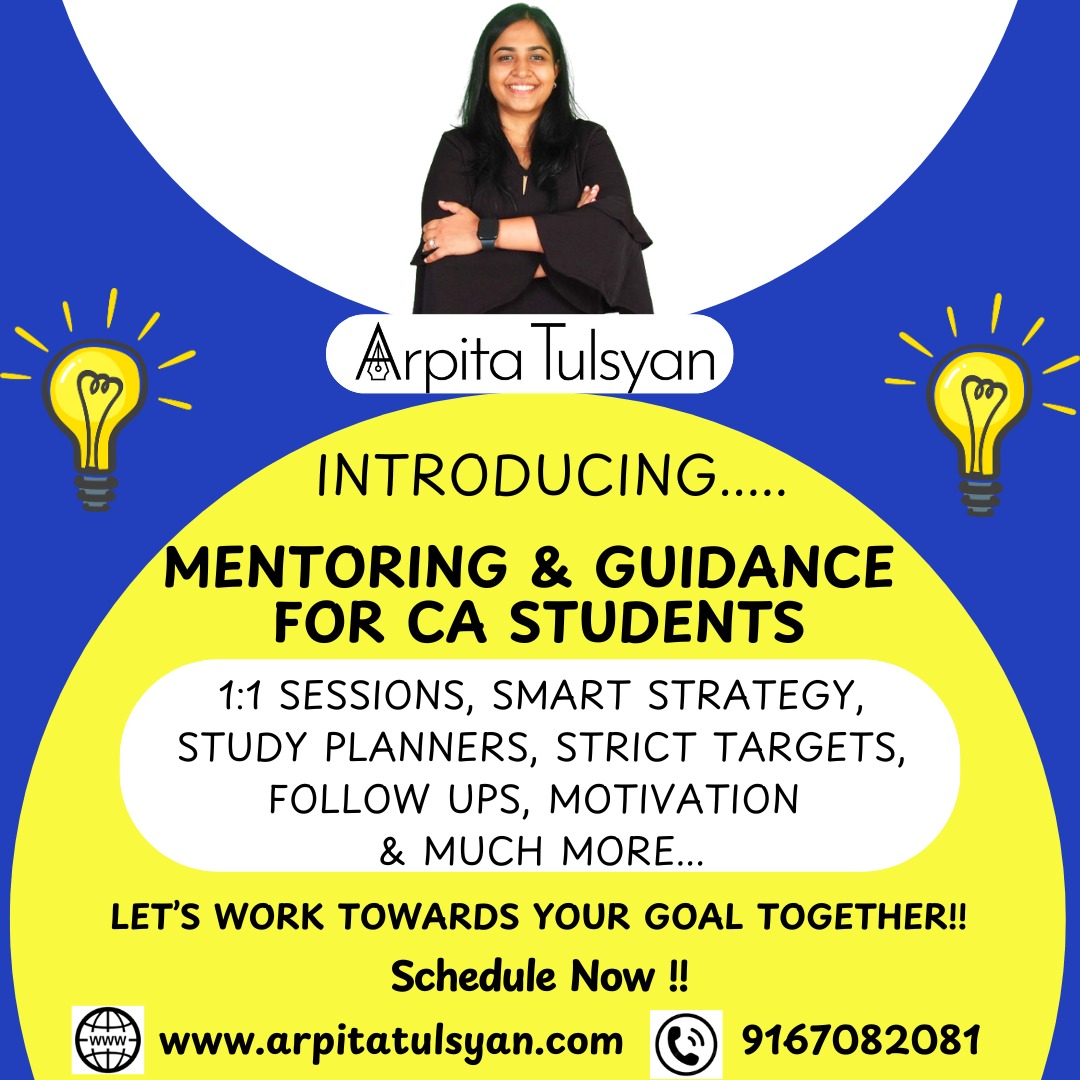 Mentoring cum Guidance Program is a professional program (involving more of a personal relationship) in which CA Arpita Tulsyan (The Mentor) will be providing Guidance, Support, Advice, Suggestions & like to you, so as to help you grow, develop & move towards success & help you in achieving the ultimate Goal i.e. to ACE your CA EXAMS.